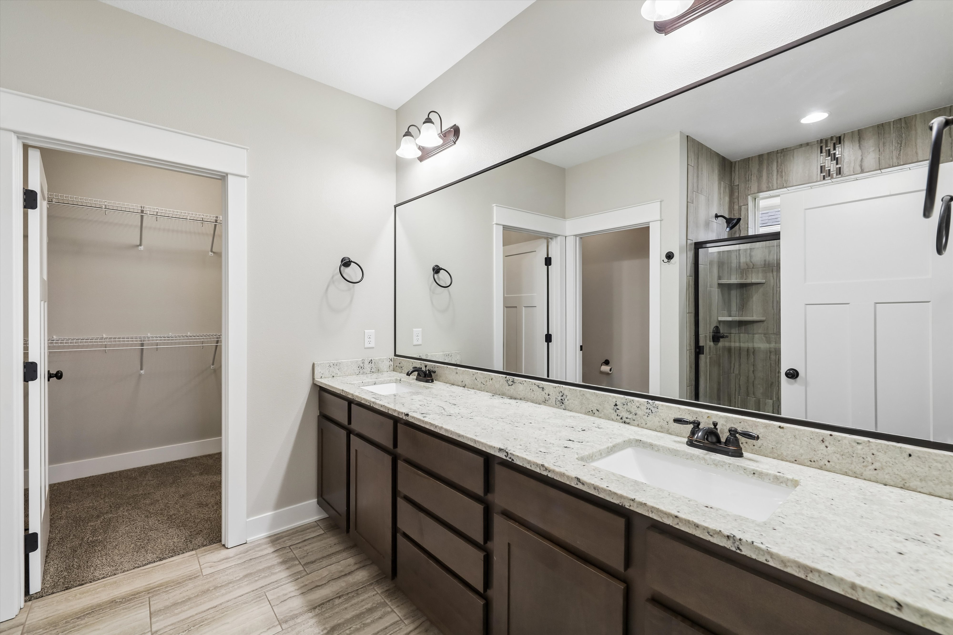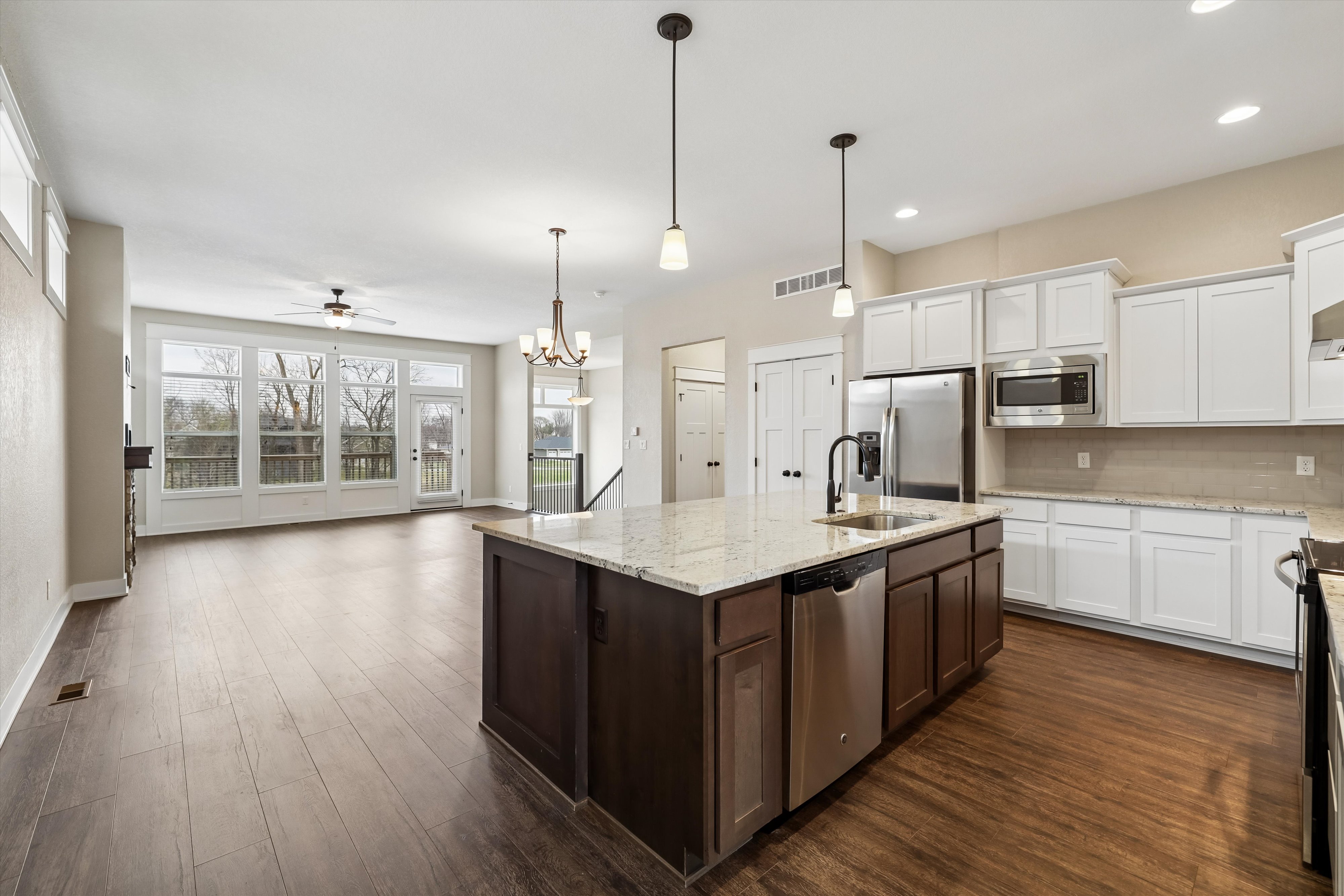 The kitchen includes quartz countertops, center island, tile backsplash, and opens to the living room with a gas fireplace, creating an ideal space for daily living and entertaining. The primary suite has a tray ceiling, dual vanities, tiled shower, and walk-in closet. The fully finished walkout lower level expands flexibility with a large rec area, wet bar, two bedrooms and full bath-perfect for guests, work, or multi-generational living.